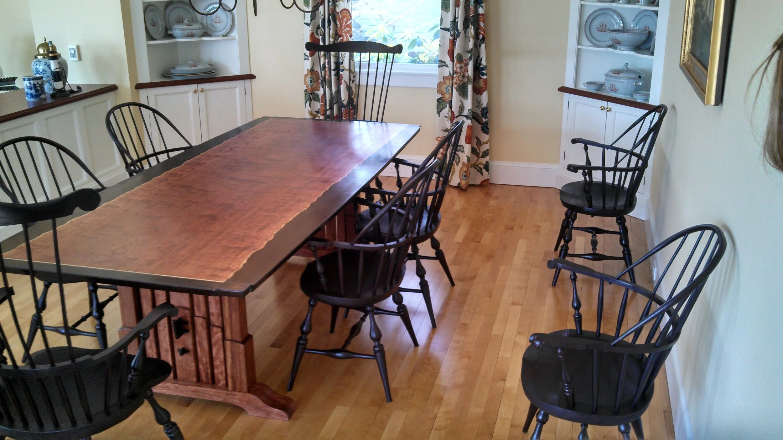“We purchased custom-made Windsor chairs from Terry Kelly. We use these chairs every day and love them! They are not only beautiful, one-of-a-kind works of art, they are exceptionally comfortable, functional and well-crafted. They are also very well-balanced, stable chairs and yet are not heavy or bulky. The coating and finish Terry uses on his chairs is exceptional—a “soft” satiny appearance that will only improve with age. Everyone who sits in these chairs admires the craftsmanship and is especially amazed at how comfortable they are to sit in, since many wooden chairs have a “hard” feel to them. These chairs are almost “form-fitting” and feel wonderful! We are thrilled to have these heirloom-quality chairs that are exceptionally functional works of art and bring us such pleasure on a daily basis. The artistry, workmanship, integrity, and quality from start to finish that Terry brings to his craft makes him one of the very best. We highly recommend Terry Kelly for custom-made, heirloom-quality furniture!”